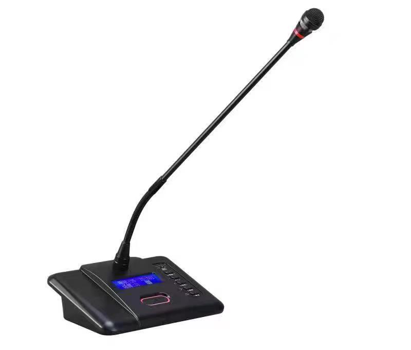 主席单元具有视像跟踪会议讨论功能的会议话筒单元,一改突破以往传统会议系统所采用8针线缆的手拉手传输方式的缺陷。而采用现代数字化主流连接方式:RJ45网线型接口,采用高可靠、高性能低功耗处理器,全数字化信号处理对整套系统在抗干扰能力、通讯稳定性和保密性上得到更有效的提升,系统采用加密智能数字化控制技术。话筒底座上设有USB接口,方便与电脑连接可实现对会议过程中进行录音或会议内容重放播音和网络信号、背景音乐播放,还可通过使用软件实时召开多人远程音频网络会议,目前网络会议支持IPAD/Iphone、IOS系统、Android系统和适用于WindowsXP/7/10电脑操作系统终端。话筒音头采用全铜金属材料设计配合本公司专利最新声学研究成果;使得语音更加清晰厚实,频响宽广,灵敏度高不易产生啸叫等特点。主席单元设有中断键,可在任何情况下强制关闭已开启的代表单元和秘书单元,便于更高效管理会议秩序。